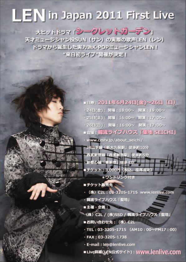ドラマから誕生した実力派K-POPミュージシャン 来日初ライブ開催 指先で奏でるピアノ旋律と情緒的かつ爆発的なボイスの持ち主。 Piano Manと呼ばれるLENが、来る2011年6月25日(土)~26日(日)の2日間、韓流ライブハウス聖地(SEICHI)にて、「LEN in Japan 2011 First Live」を開催致します。 12才の時から作曲と作詞を始め、シンガーソングライターとして頭角を現したLENは、 2006年“サイワールドの名誉殿堂”に選ばれ、その才能を世に知らしめました。また、ラジオ及びライブ活動、ミュージカル出演等により、音楽を一方通行に終わらせることなく、対ファンのスタイルを大切にしています。 絶妙なバランスの歌詞と曲調と歌声。そこから生み出される彼の音楽は、時には癒しに、時には励ましにと、聴く人々の心の支えになります。 そんな韓国が誇るPiano Man LENが、ここ日本で初ライブを披露します。ぜひ、このスペシャル・ライブに御期待下さい。 【コンサート概要】 ■名称:「LEN in Japan 2011 First Live」 ■日時:2011年6月25日(土)~26日(日) ・24日(金):開場:18:00~ 開演19:00~ ・25日(土)、26日(日):開場:16:00~ 開演17:00~ サイン会&握手会つき ファンクラブ入会者にはツーショットつきです。 カメラは持参してください。 ■Live詳細(LEN公式サイト):www.lenlive.com(更新中、5月23日オープン) 登録無料です。 ■会場:韓流ライブハウス「聖地(SEICHI)」 ・JR山手線「新大久保駅」、 ・西武新宿線「西武新宿駅」徒歩約5分、 ・副都心線「東新宿」徒歩4分 チケットの申し込みは↓ ■チケット:2,500円(税込、座席指定)*ドリンク代別(500円) ■主催・企画:(株)C2L /(株)パイネック/(株)SSD ■お問い合わせ先:(株)C2L ・TEL:03‐3205‐1715 (AM10:00~PM17:00) ・FAX:03-3205-1738 ・E-mail:len@lenlive.com