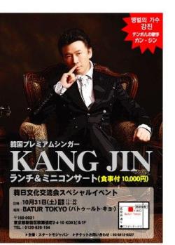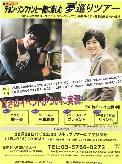 営業時間:10:00~18:00 (年中無休) 住所:〒106-0032 東京都港区六本木3-1-29 1F 当日はセレモニーもあるそうです。 (但し、天候によっては中止も) ドラマ【太陽にむかって】でサンウと共演していたチョン・ソンファンさんのツアーです ![]() 申込開始:10月28日(水)12:00 締切 11月4日(水)17:00 (但し、定員になり次第終了します) 申込、問合せ トップツアー(株) TEL 03-5766-0272 FAX 03-5766-0203 月~金9:00~18:00(土、日、祝祭日を除く)担当原田、菊池 お値段も手頃で~ハグあり~握手会 ![]() ![]() ![]() 詳細は、こちら ![]() http://toptour.jp/branch/tokyo/pdf/jungsunghwan20091126.pdf 韓国では皆が知っていて、カラオケでも人気のある”テンポル”の歌手カン・ジンさんを迎え、下記日時でランチ&ミニコンサートを下記の日程で開催致します。 |